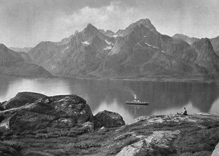 Blick vom Digermulkollen auf den Raftsund. Das Schiff ist die Monte Sarmiento.
